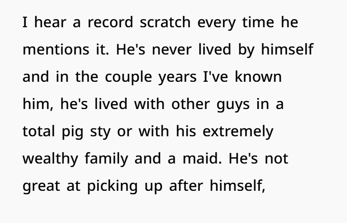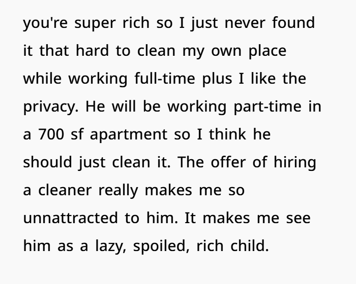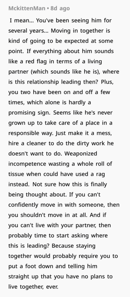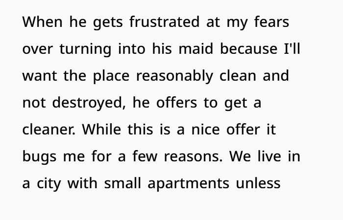 You’re absolutely right that wanting someone’s place “reasonably clean and not destroyed” is not asking for perfection — it’s asking for basic respect. When you hear “He’ll hire a cleaner,” your brain flags: “Wait, so your baseline is messy enough you need someone else? And you’re okay with that?”