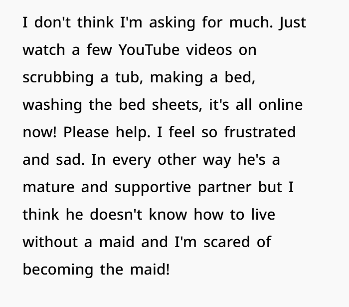You mention you fear becoming his maid. That word “maid” is strong—but what you’re really pointing at is the invisible labour: the cleaning, the mental reminders (“Did you take out the trash?”), the “I’ll just do it because you won’t” attitude. Psychologists call this the mental load of household labour. One paper shows that women often bear not only the tasks, but the planning, monitoring and emotional weight of keeping a home. arXiv