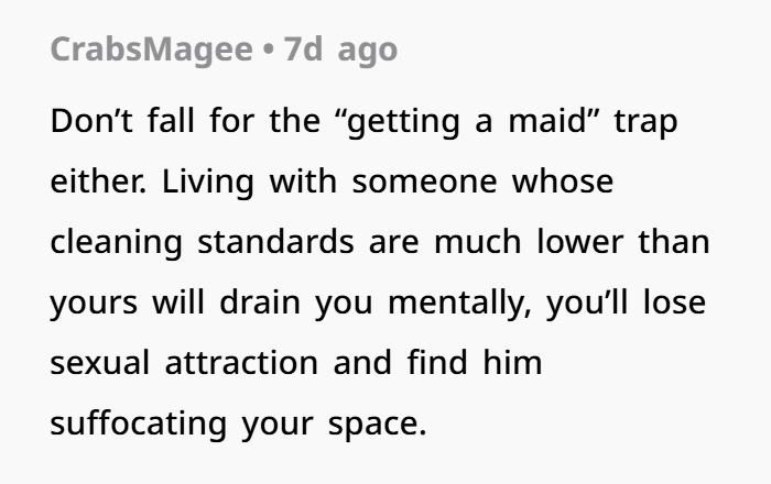 - “I’m not looking for a maid—I’m looking for a home we both contribute to. So I need to see you taking responsibility in your own space so I know that when we move in together it’s a shared effort.”