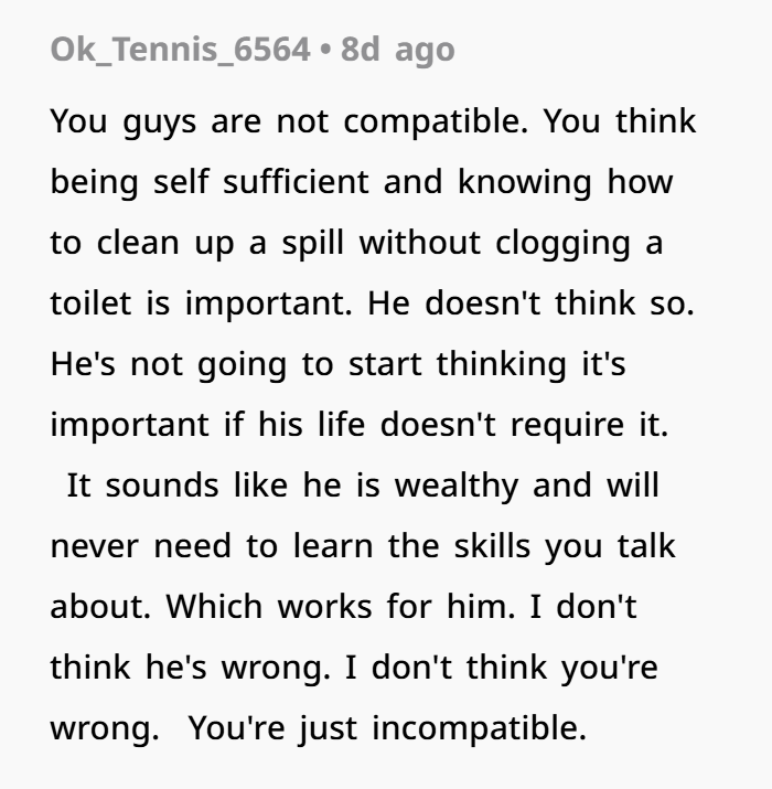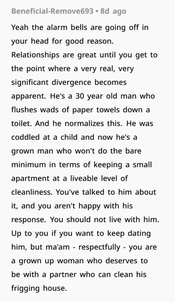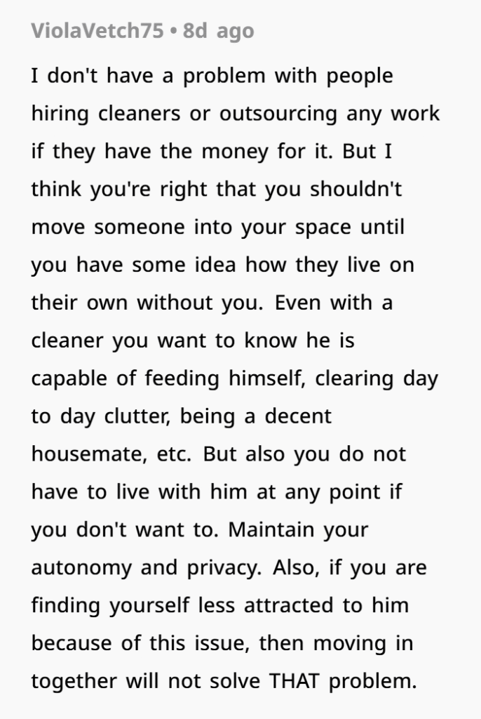 If he insists “I’ll hire a cleaner” and that doesn’t sit well for you, you might say: “Sure, but a cleaner doesn’t substitute for you taking basic responsibility. I need to know you’re comfortable doing that too.” If he sees it as you being unfair/unreasonable, that’s a red flag—not you. Because this is about day‑to‑day living, not romance only.