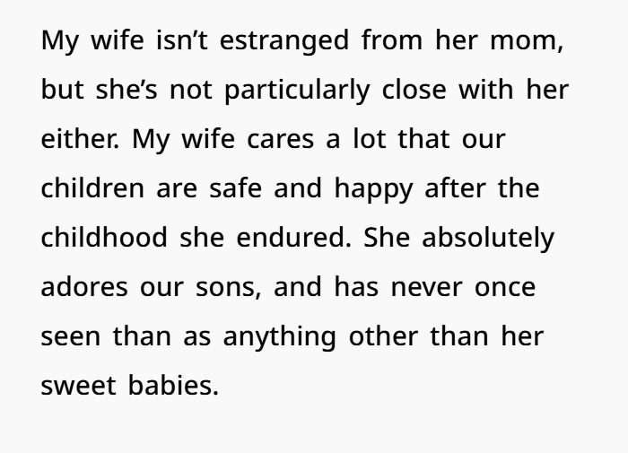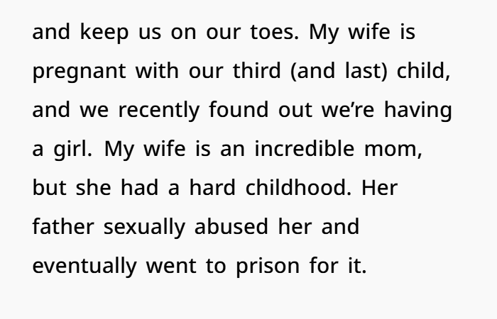 I’m a 35‑year‑old father with twin five‑year‑old boys and a baby girl on the way. My wife had a traumatic childhood — her father sexually abused her and went to prison. She’s healing, strong, and so protective of our boys. We recently shared the good news with family that we’re expecting a daughter.