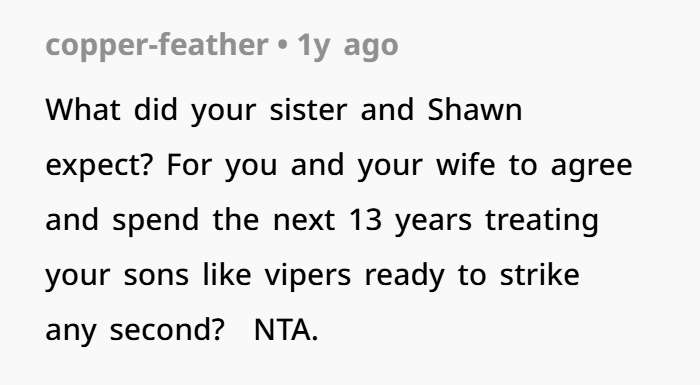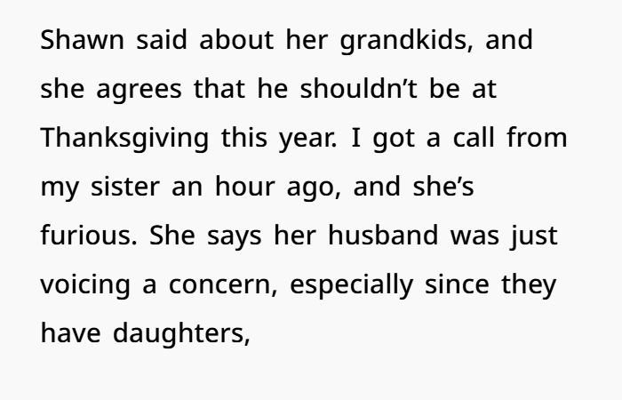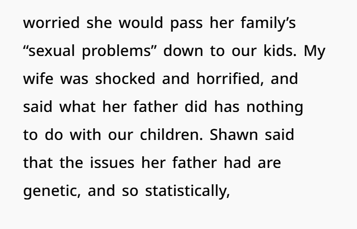 At dinner with my sister and her husband (my brother‑in‑law, “Shawn”), the mood changed when Shawn congratulated us … and then said he was relieved we’re not having another boy. He went on to ask my wife if she ever worried she would pass her father’s “sexual problems” down to our boys, claiming the issues were genetic and thus boys are “at risk”. My wife was devastated. I was horrified. Afterwards I spoke with my mom and decided: if Shawn and my sister are going to attend Thanksgiving, we’ll instead celebrate separately — in short: Shawn is uninvited. My sister is furious, says we’re punishing her daughters for his words. I feel like my boys were judged for a crime they could never commit and for a past my wife’s father created. AITAH?
