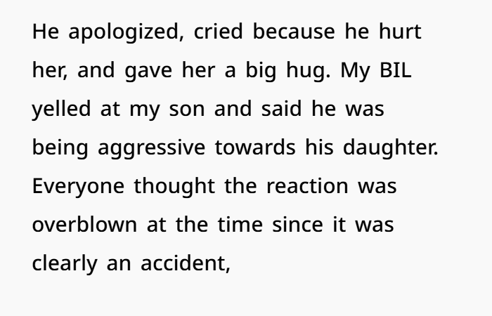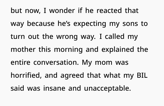 - The BIL’s comments weren’t isolated—they appear to be part of a pattern (he’s made odd comments before, particularly around your boys). You noticed his behavior before, and now this.