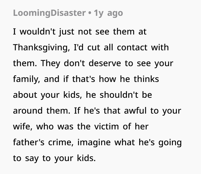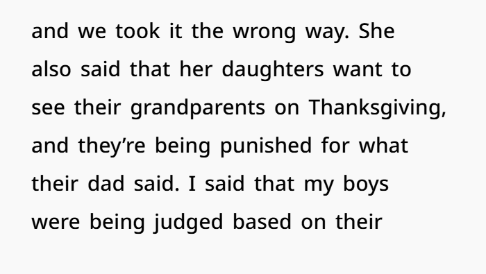 - Thanksgiving is not just a meal — it’s emotional space, where families show up for each other. Your wife was in tears the whole drive home. That indicates a genuine harm — your decision aims to prevent further harm.