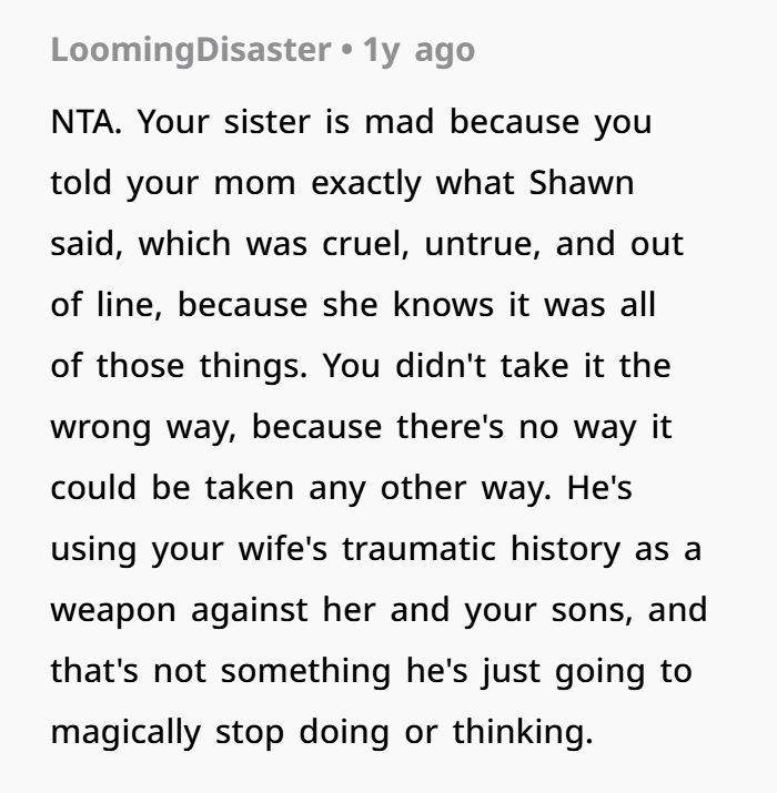 - You consulted your mother and she agreed the BIL’s comment was “insane and unacceptable.” So you have backup.