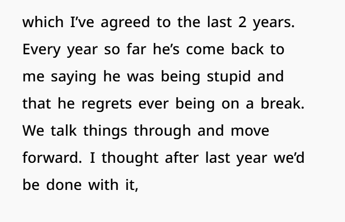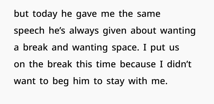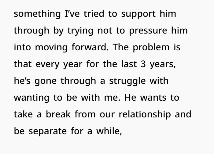 Okay, first off—taking a break isn’t always a bad thing. Sometimes couples need a pause to reset, especially during long-distance or high-stress periods. But when someone keeps asking for a break year after year, it’s not just a one-off. It’s a pattern.