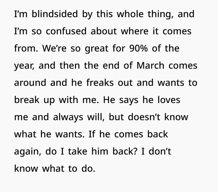 But there’s a catch—every year, like clockwork, her boyfriend pulls the same move. Around March or April, he starts to question the relationship. He asks for space. He says he doesn’t know what he wants. And every year, he comes back a few months later, full of regret, asking for a second chance. She’s taken him back each time. But this year feels different. She’s tired. She’s confused. And she’s finally asking the real question: should she keep giving him another chance?