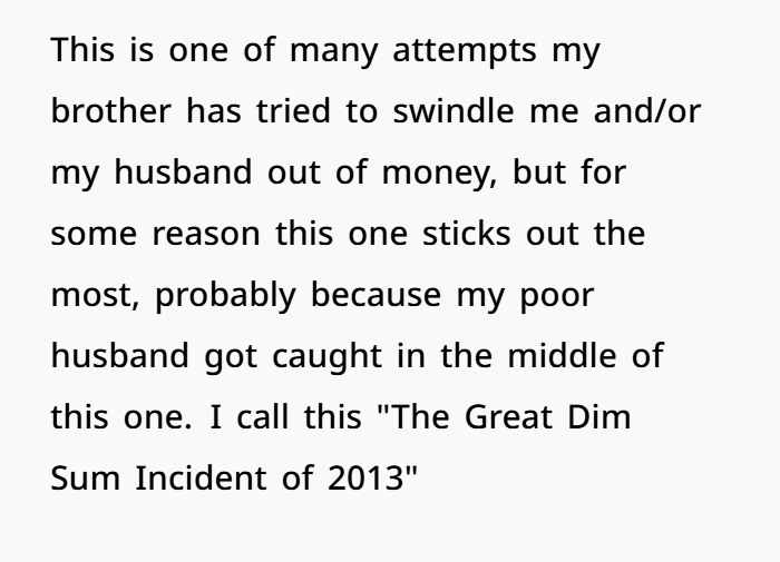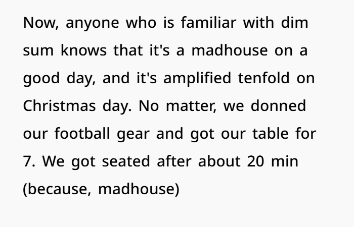 Back in 2013, we agreed to spend Christmas day out for dim sum with my brother (EB), his wife (SIL), their kids and his mother-in-law. It felt like a nice compromise: everyone free on Christmas, kids happy, food plenty. We thought we’d split — they’d cover their portion, we’d cover ours.