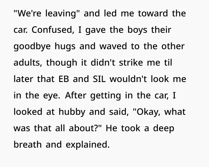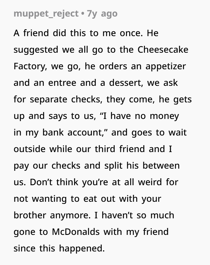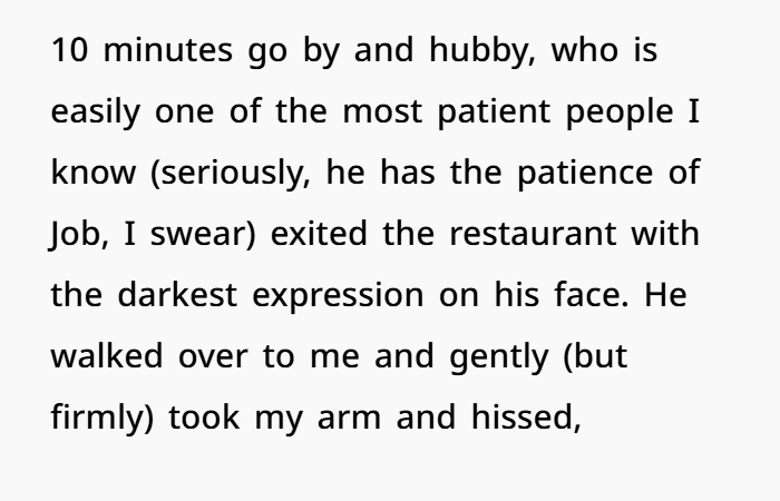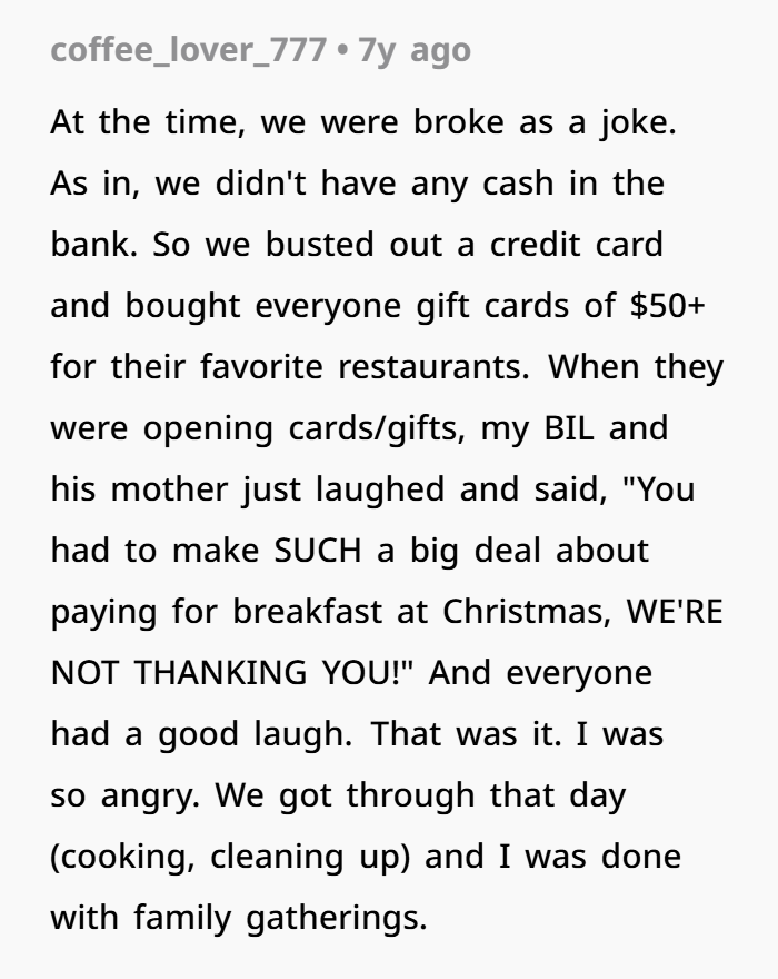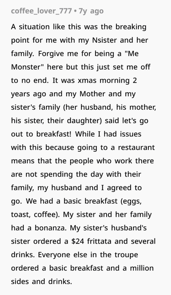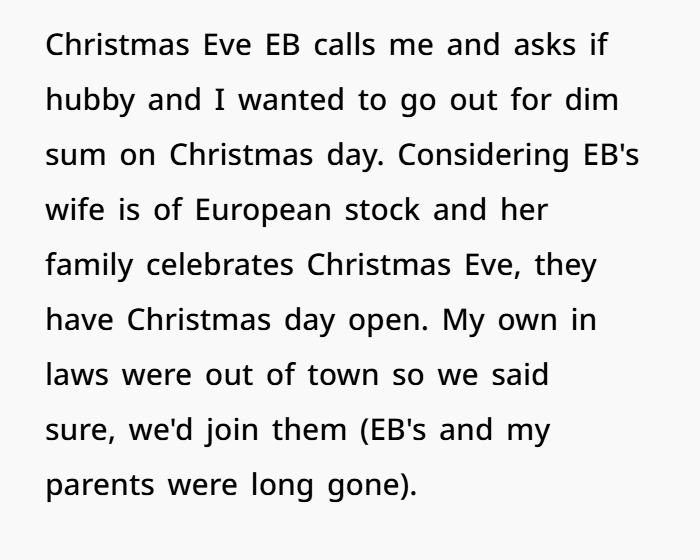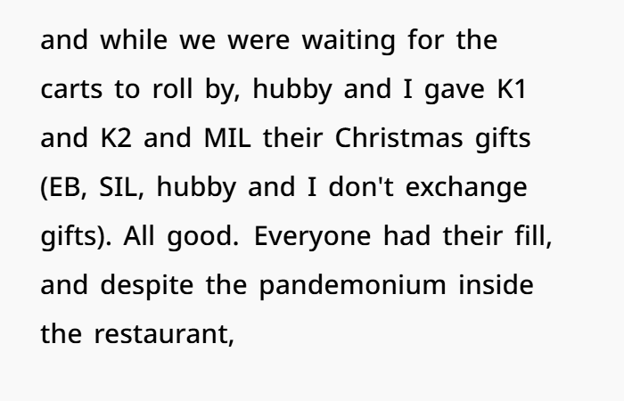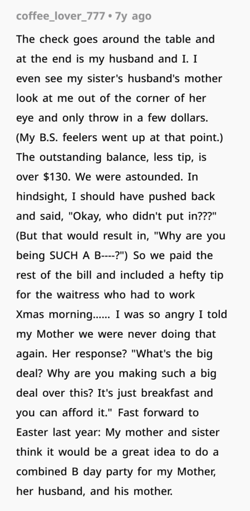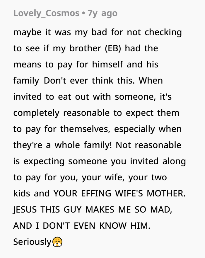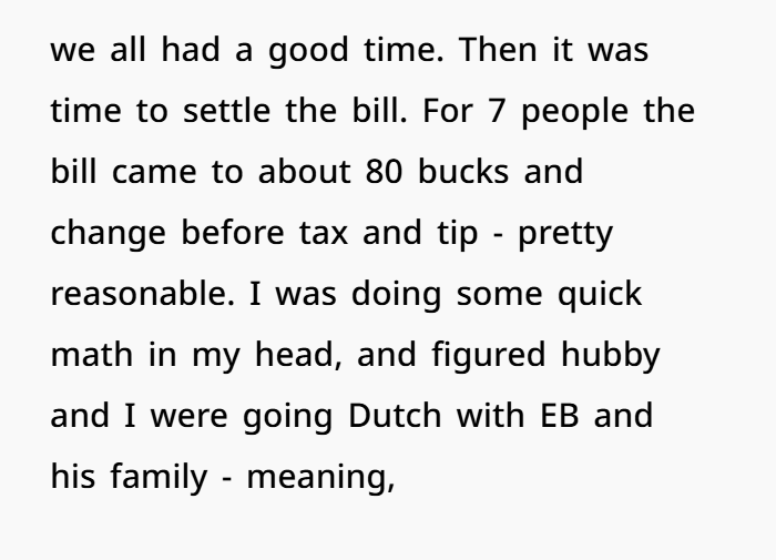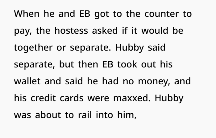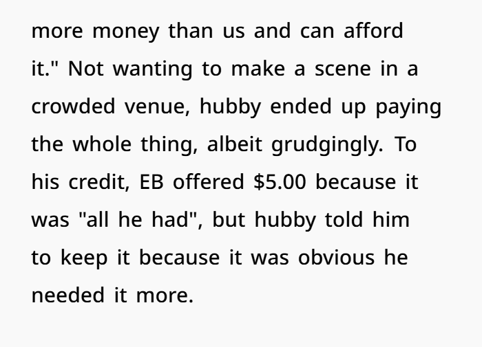 But when the bill came, EB politely informed the pay desk he had no money and his cards were maxed out. SIL and MIL jumped in, guilt‑tripping my husband by claiming he had “more money than them,” that he’d ruin Christmas for their kids if he didn’t pay. So with kids eagerly watching, and the restaurant packed, my husband — Mr. Patience — swallowed the pressure and paid for all seven of us. EB offered five bucks as a “contribution,” and that was that. Since then, we never trusted their dinner invitations again.