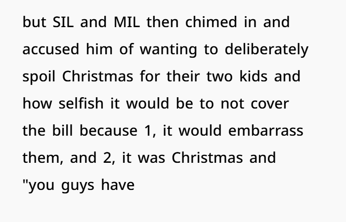 If your brother had just asked: “Hey, can you spot us this once? We’ll repay you soon,” that’s fine. You choose whether to do it. But doing that without discussion — especially after inviting everyone out — and then guilt‑tripping you with “It’s Christmas, you have means” crosses the line. That pushes it from generosity into manipulation and entitlement.