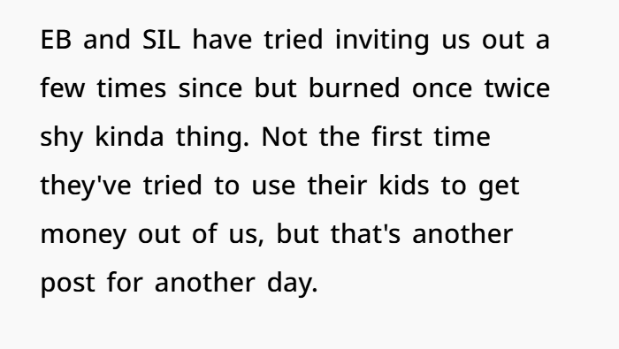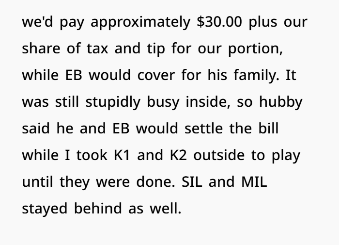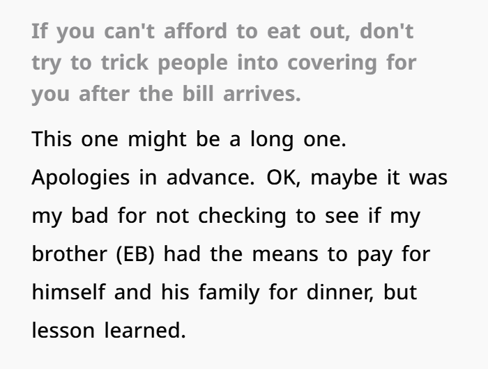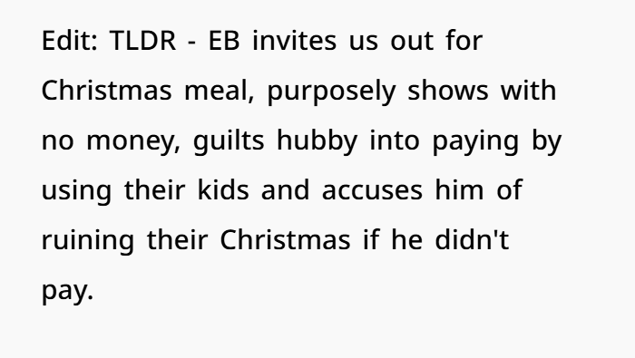 Your brother invited you all, so likely he assumed or expected you to pay. But since no upfront discussion about who’d pay, the default social assumption should have been that everyone pays their own way (or that the inviter explicitly covers). When EB showed up empty‑handed and let others guilt‑trip your husband into covering — that’s using social pressure to avoid accountability. That counts as manipulation.