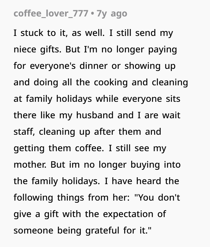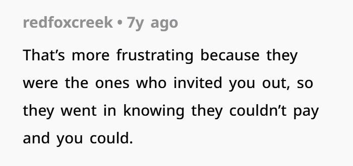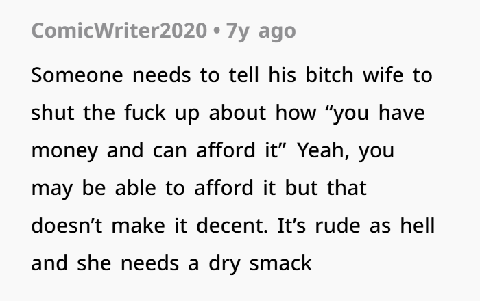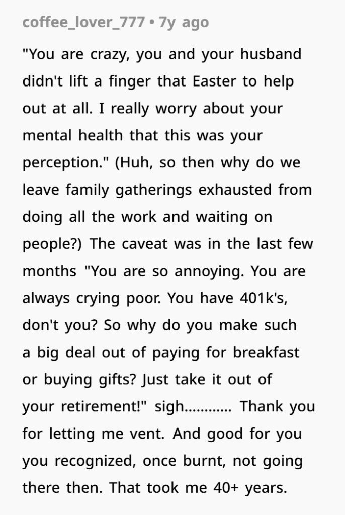 But one woman ended up realizing that her entitled relatives were perfectly happy make her husband foot the bill