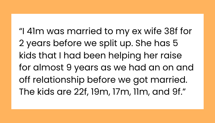 Let me start by saying this isn’t easy for me to talk about, but I’m here, looking for some perspective on whether I made the right choice or if I was too harsh. I’m 41, and I was married to my ex-wife, who’s 38, for about two years. But before that, we had a back-and-forth relationship for almost nine years before we actually got married. During that time, I helped raise her five kids, who were 22, 19, 17, 11, and 9 when we split. I stepped up and became a father figure to them, especially since their biological dads weren’t around. I treated them like my own, and we had a solid relationship.