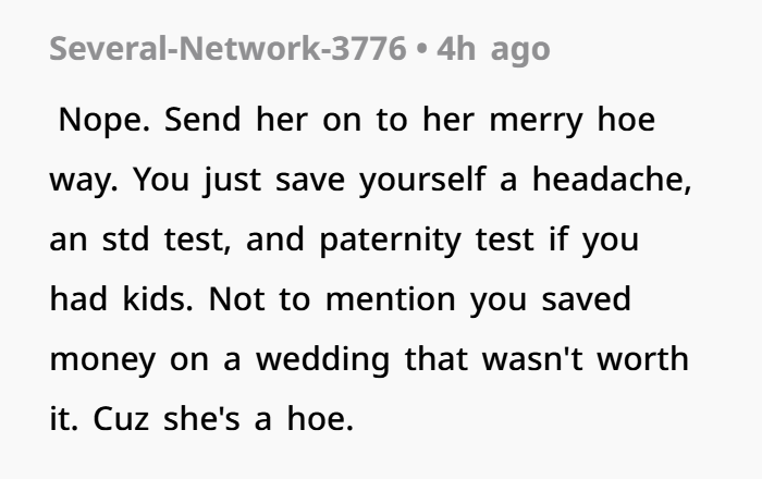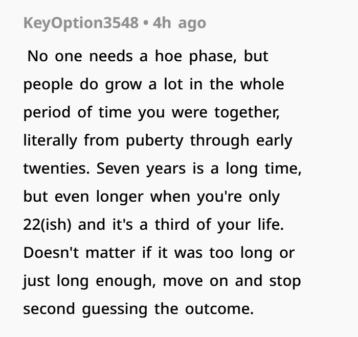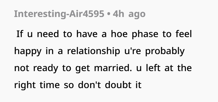 Now about that “hoe phase” comment. On its own, it’s not always a dealbreaker. People get curious, wonder about missed experiences—it happens. But context matters. This wasn’t a calm talk or honest convo. It came out during a fight, mixed with anger, disrespect, and her throwing the engagement ring. That’s not healthy communication in relationships. That’s using emotions like a weapon.