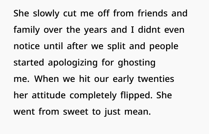 One big red flag early on was isolation. You said she slowly pulled you away from friends and family—and the wild part is, you didn’t even notice. That happens a lot in controlling situations. It’s not sudden. It’s slow and sneaky. Starts with small complaints, awkward vibes around your people, or guilt trips. Next thing you know, your whole world is just… her. That’s not love. That’s codependency being built on purpose. A lot of relationship psychology studies explain this exact behavior.