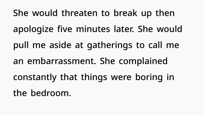 Then there’s how she spoke to you. Calling you an embarrassment, yelling in front of others, putting you down both privately and publicly—that’s not normal arguing. That’s straight-up emotional damage. Not just “bad communication.” Real verbal abuse signs. Over time, this kind of behavior hits your confidence hard. You start doubting yourself, thinking maybe you’re the problem. That’s why people stay stuck—it messes with your head. Even mental health experts link this to long-term emotional harm.