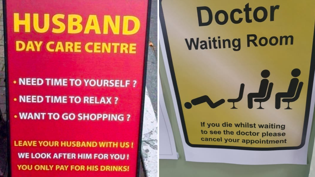 From signs that are way too honest to confusing warning signs that make zero sense, these moments prove that not every instruction is well thought out. You’ll see public signs that raise more questions than answers, funny notice boards, and even business signs that probably needed a second review. A “Husband Day Care Centre” with questionable services or a doctor’s clinic sign giving brutally honest advice — awkward, confusing, and hilarious all at once.