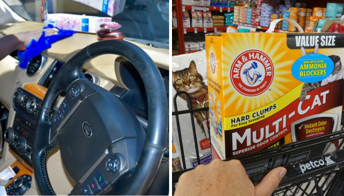 Sprinkle baking soda on the seats before vacuuming. Let it sit a bit. Then vacuum it all up. It kills odors fast and keeps your car interior fresh. Cheap car cleaning win.