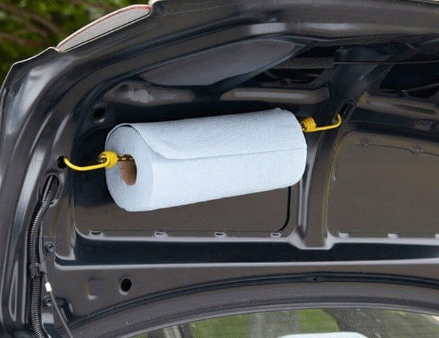 Attach an elastic cord to the inside of your trunk lid and hang a roll there. Easy reach. No mess. Makes basic car maintenance way easier when you need it.
