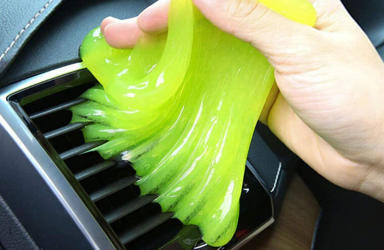 Press it into air vents, cup holders, and tight spots. It grabs dust and crumbs fast. Stuff vacuums miss. Rinse the slime and reuse it. Easy DIY car interior cleaning trick.