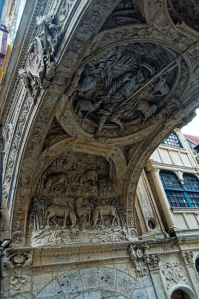 This arch sits beneath the Gros-Horloge in Rouen. Built in the 14th century. Look closely and you’ll see Rouen’s coat of arms, angels holding it, and Christ shown as the good shepherd. The carving work is next level. Easy to miss. Hard to forget.