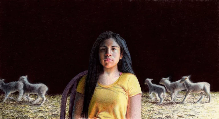#7 Nicolas V. Sanchez, “Mariana with lambs” (2018), color ballpoint pen on paper, 5.5 x 10.5 inches