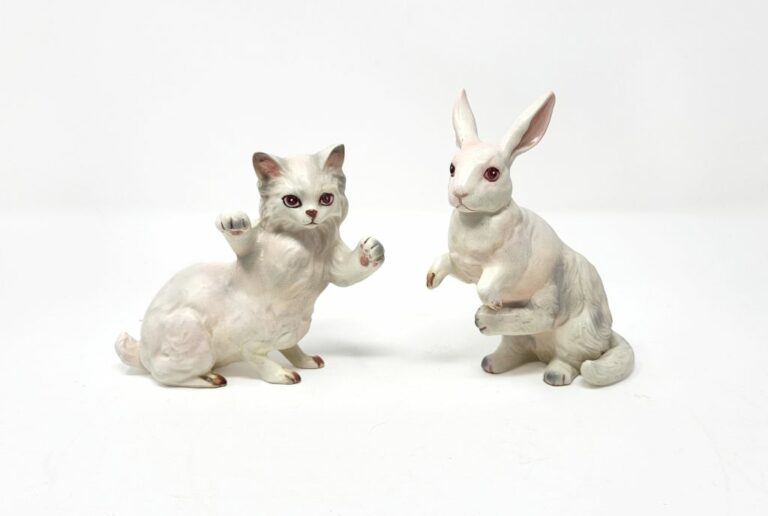 #9 Debra Broz, left: “White Persian Cat Rabbit,” (2025), secondhand ceramic figurines and mixed media, 4.25 × 5 × 2 inches; right: “White Rabbit Persian Cat,” (2025), secondhand ceramic figurines and mixed media, 5 × 4 × 2.5 inches