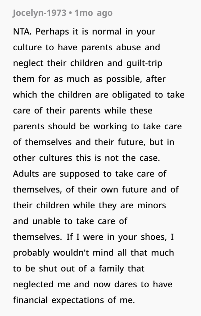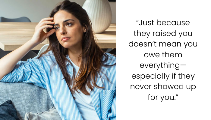 Let’s stop pretending that being born into a family means you owe them forever. If they didn’t raise you, protect you, or love you right, you don’t owe them money just because they have your last name.