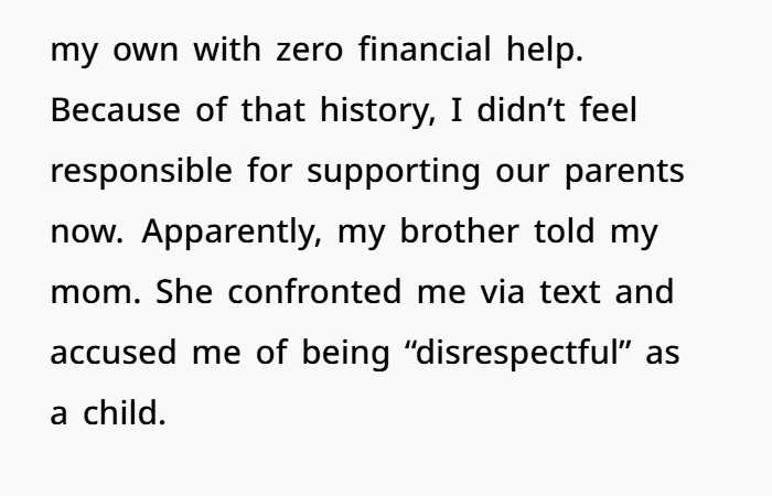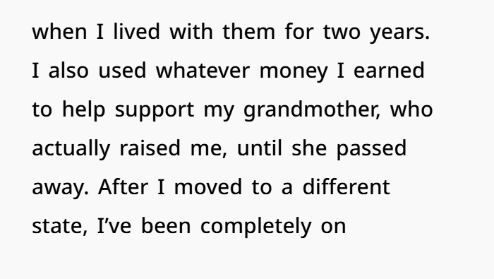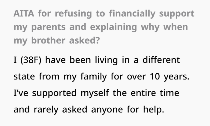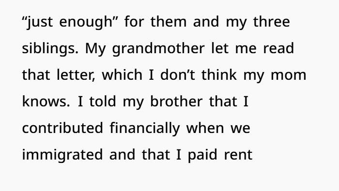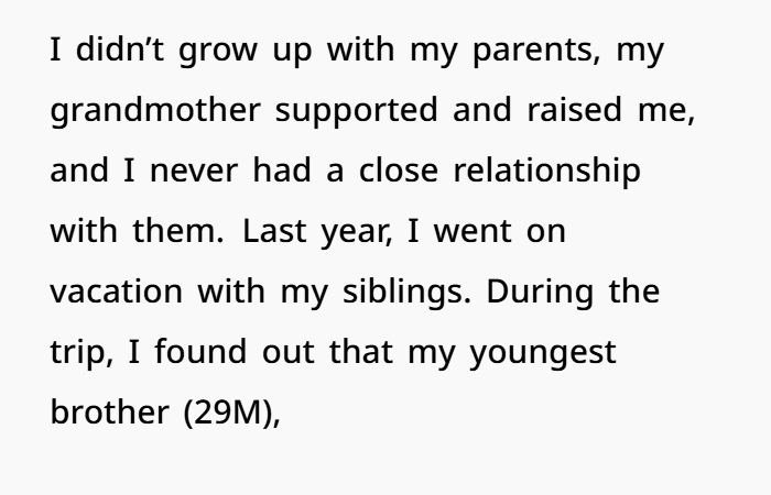 When a 38-year-old woman was asked by her younger brother why she wasn’t helping financially support their parents, she answered honestly—and the fallout was massive. After years of being left out, emotionally neglected, and even manipulated as a child, she laid out the real reason: her parents hadn’t supported her growing up. They gave her nothing—not money, not care, not love. Her grandmother raised her while the rest of the family lived comfortably without her.