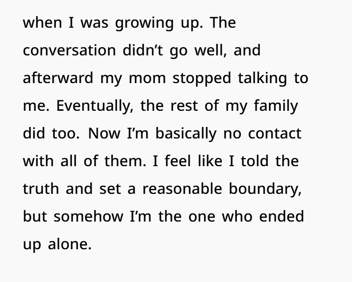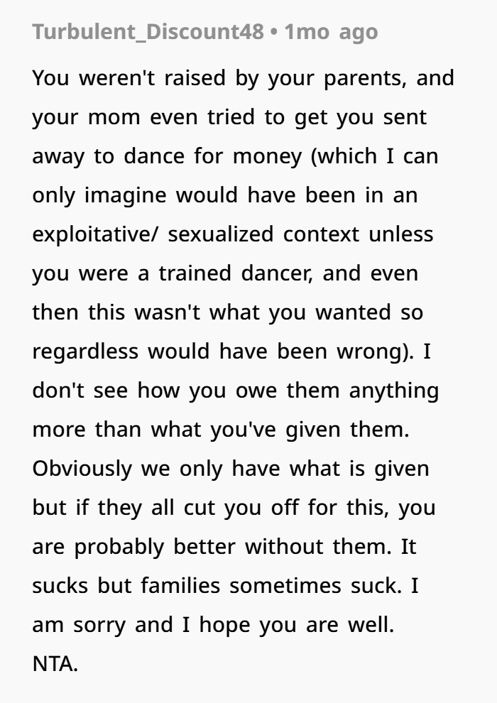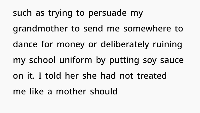 That one truth bomb caused a family implosion. Her mother accused her of being disrespectful, ignoring her own history of cruelty—including trying to send her overseas to “dance” in a situation that likely could have led to trafficking, and deliberately destroying her school uniform to hurt her. And now? The entire family has gone no contact with her. But the real question is… was she wrong to finally say no?