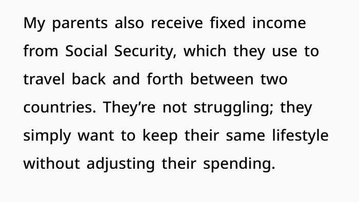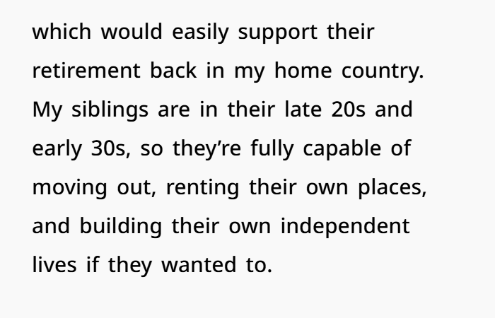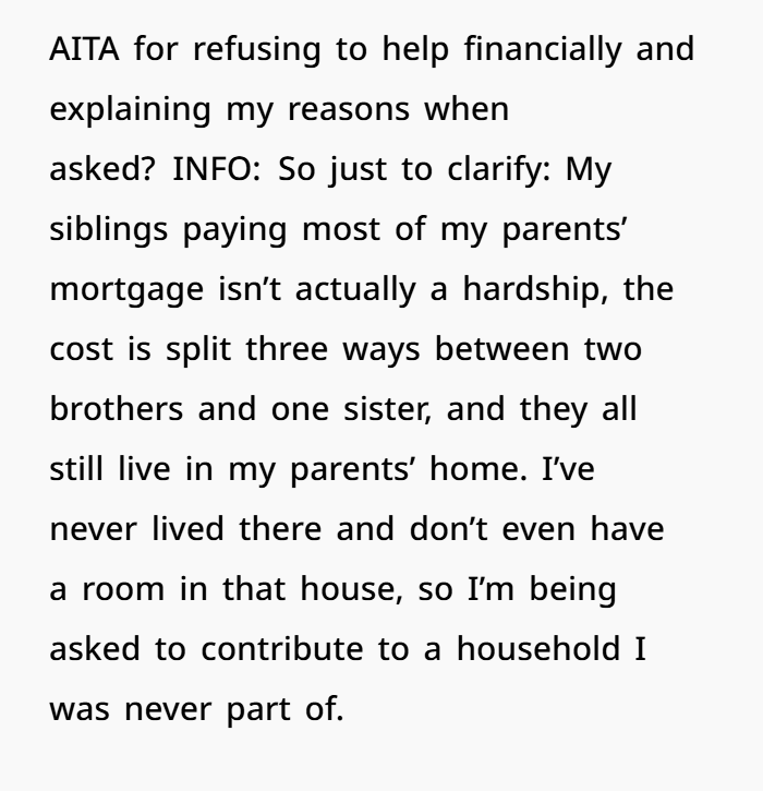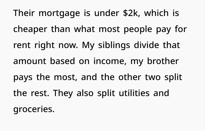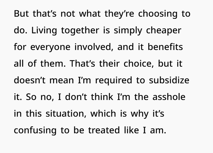 Her siblings, meanwhile, chose to live together. They split bills, live in the parents’ house, and have a shared lifestyle. That’s their call. But just because it’s cheaper for them to stay in that bubble doesn’t mean their sister has to fund it.