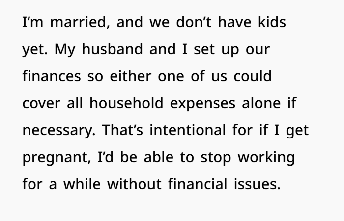 This woman and her husband made smart, intentional choices. They structured their life so either one of them could handle expenses alone. That’s planning. That’s effort. That’s not a license for other people to freeload—especially people who never once helped build that life.