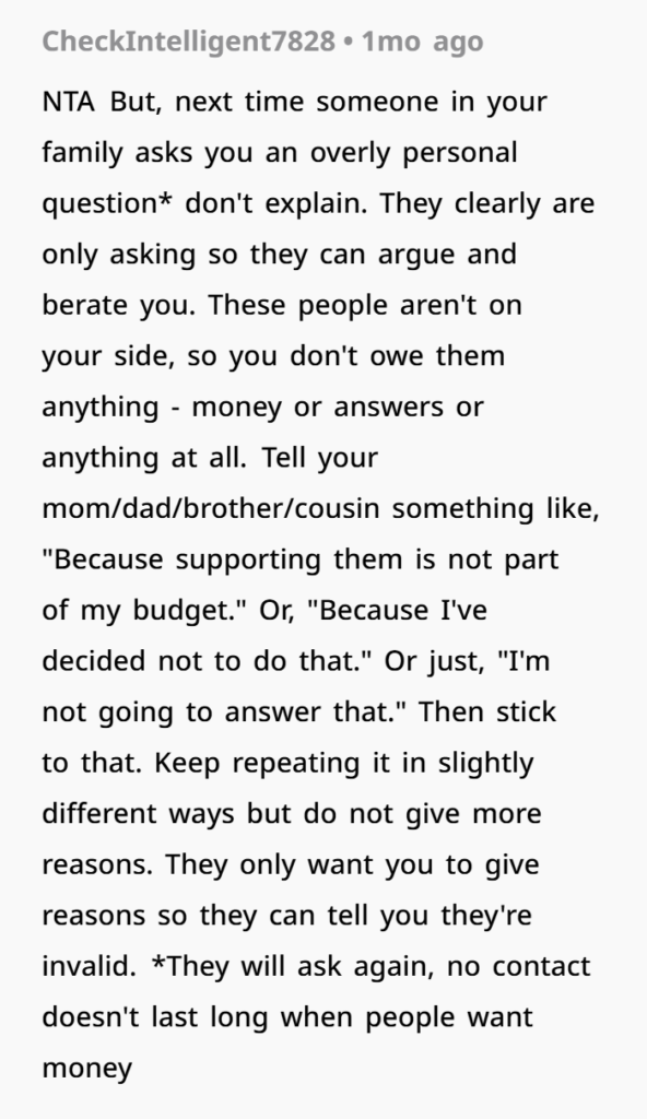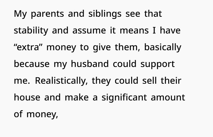 Here’s another layer to the guilt trip: because she and her husband are stable, her family assumes she’s got “extra money” lying around. But financial health doesn’t mean you owe others—especially when that stability was built without their help.