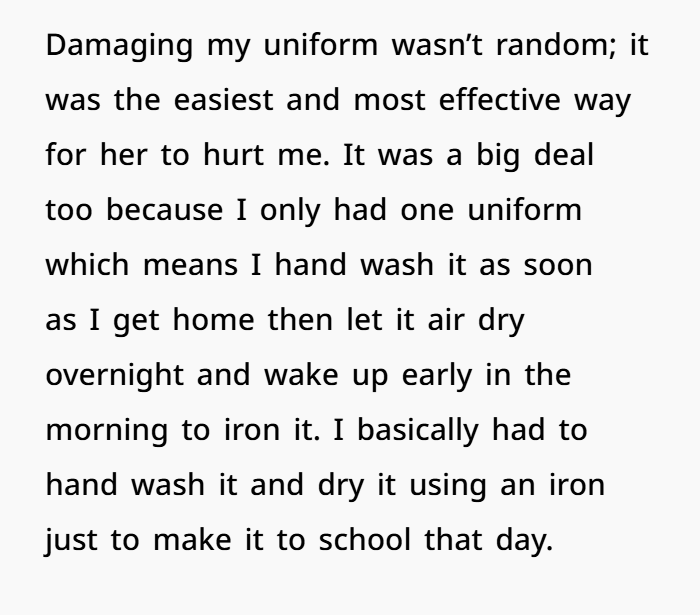 - Her mother sabotaged her school uniform, knowing how much it meant.