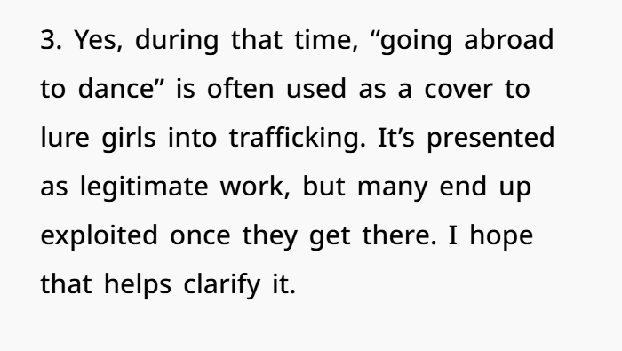 - She was pressured into potentially dangerous situations abroad under the guise of “dancing.”