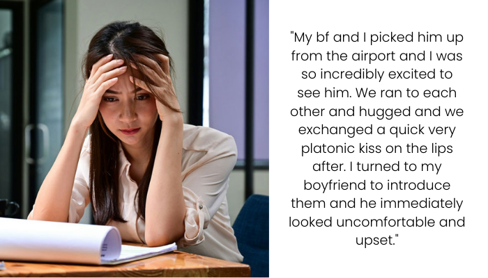 When the day came, I couldn’t hold in my excitement. My friend had just landed, and my boyfriend and I went to pick him up together. As soon as we saw each other, I ran up to him, and we shared a big hug. I was so happy to see him again that without thinking, I kissed him on the lips. To me, it was just a quick, platonic kiss—like a family member or a long-lost friend.
