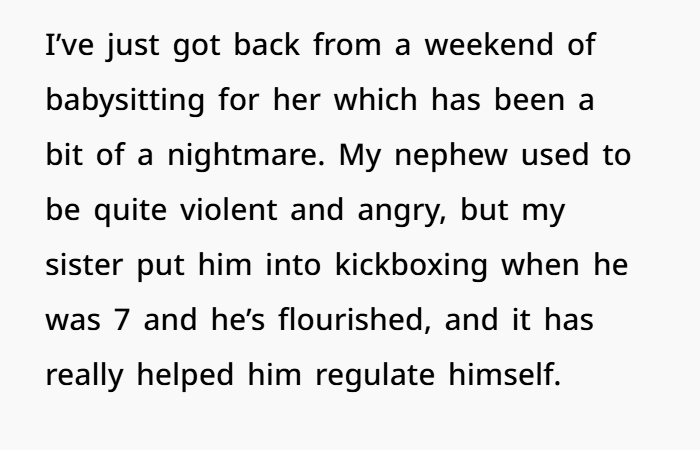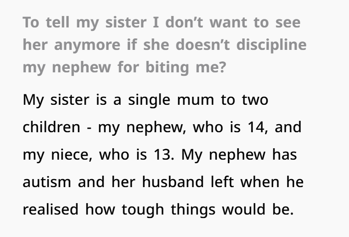 This is a story about boundaries, family guilt, and what happens when someone is pushed to their limit — literally and emotionally. The OP (original poster) had just returned from babysitting her 14-year-old nephew, who has autism. She knew he was overstimulated, and she respected the routine. But when it was time to put the iPad away and get ready for sleep, he responded by grabbing her and biting her — hard.