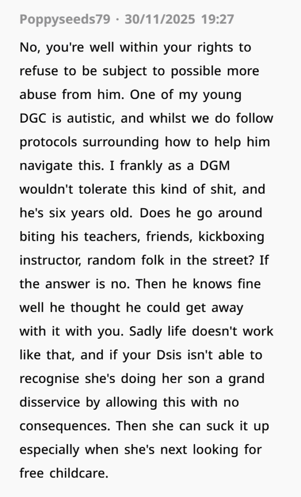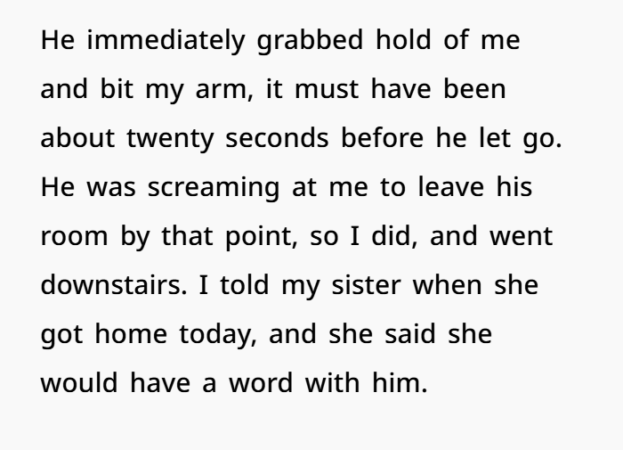 The bite lasted around twenty seconds. Long enough to cause real pain and bruising. She told her sister, expecting some level of consequence, discussion, something. Instead, her sister brushed it off, saying her son was overwhelmed and that’s “just how it is.”