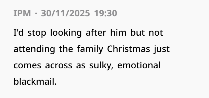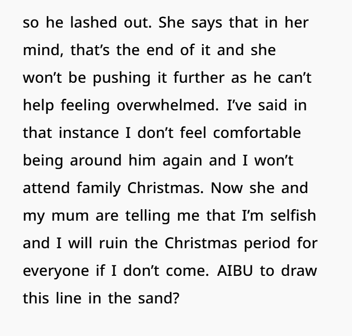 But for the OP? That was it. She told her sister she won’t be around anymore if this behavior isn’t addressed. Now her sister — and their mother — are calling her selfish. She’s being told she’ll “ruin Christmas” if she doesn’t show up. So she turned to Reddit with one question: Am I being unreasonable for setting this boundary?