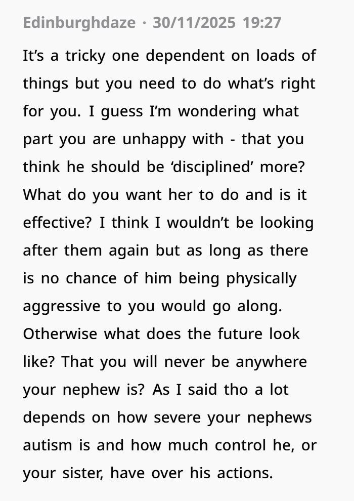 The poster shared that her sister was a single mom with two children, and that her teenage son, who had autism, sometimes got violent and angry