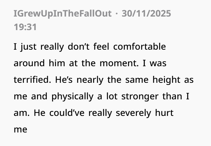 Here’s the thing — you’re not ruining anything. You didn’t choose violence. You didn’t sweep it under the rug. You’re setting a boundary because you don’t feel safe. That’s not dramatic — that’s reasonable.