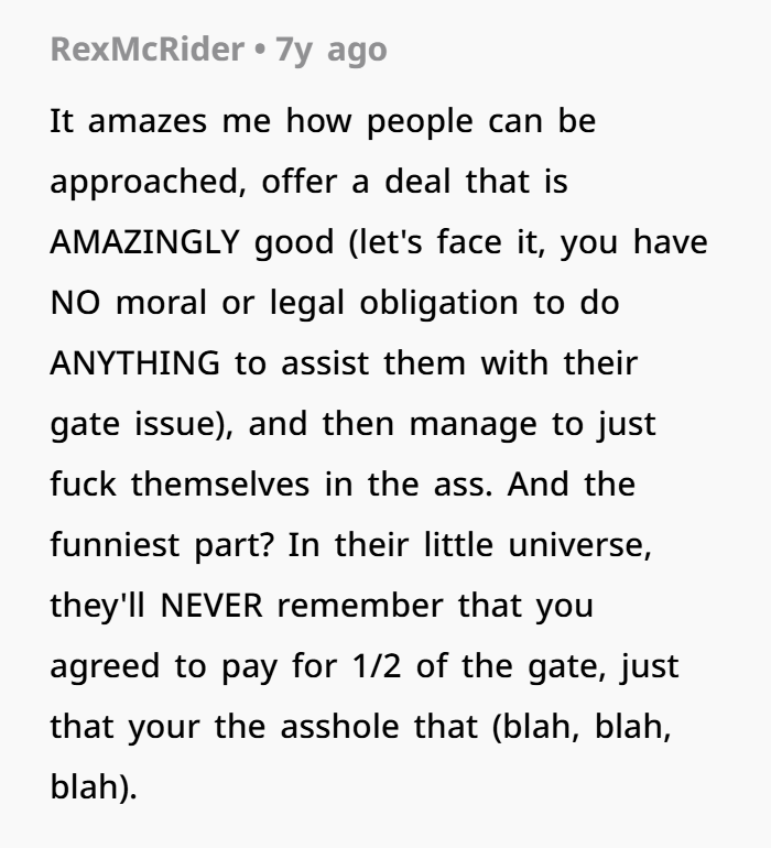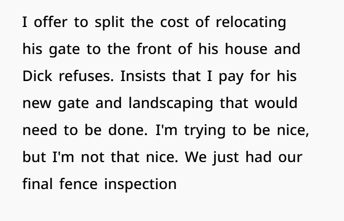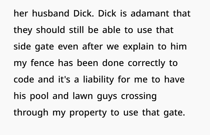 You bought a house, got a survey, hired professionals, and built a fence to code — a classic privacy fence in front, chain‑link in back. The fence sits on your property, not straddling any shared boundary line. Once the fence went up, your neighbor, “Karen,” realized she lost access to a side‑gate next to her pool. She flipped out, threatened to call the city, and ultimately sent her husband (“Dick”) to demand you relocate her gate so she could keep using it. When you refused, offering to help split costs — and failing to get cooperation — you locked your side‑gate and plan to plant hedges to block off the old access.