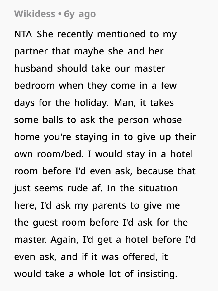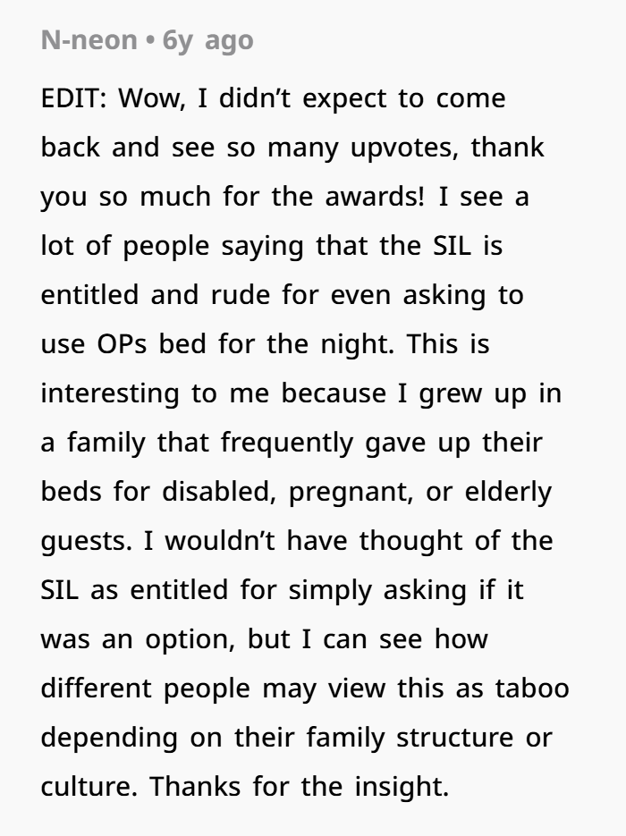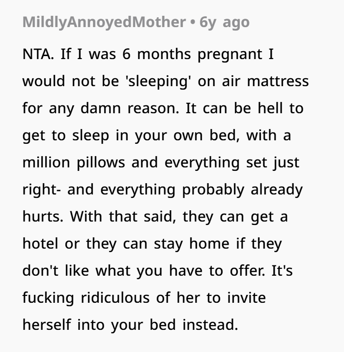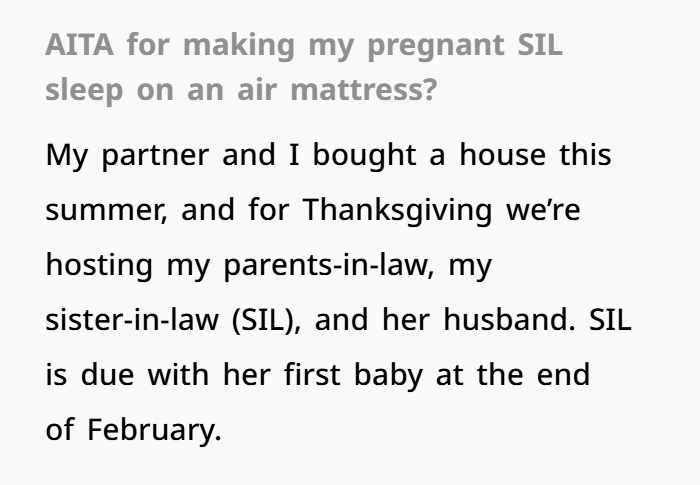 Now the host is left wondering: Am I being selfish for wanting to sleep in my own bed during my limited time at home? Or is my SIL crossing boundaries with her comfort demands just because she’s expecting?