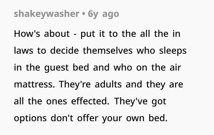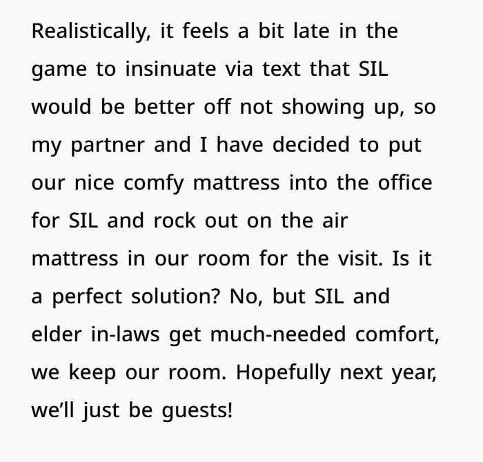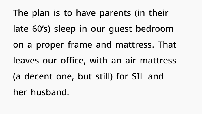 Let’s also not forget: you already made a compromise. You’re giving her the nicer mattress, just not the actual bedroom. That’s called thoughtful hosting, not being inconsiderate. And by moving the mattress to the office and taking the air mattress yourselves, you’re actually doing more than what many hosts would.
