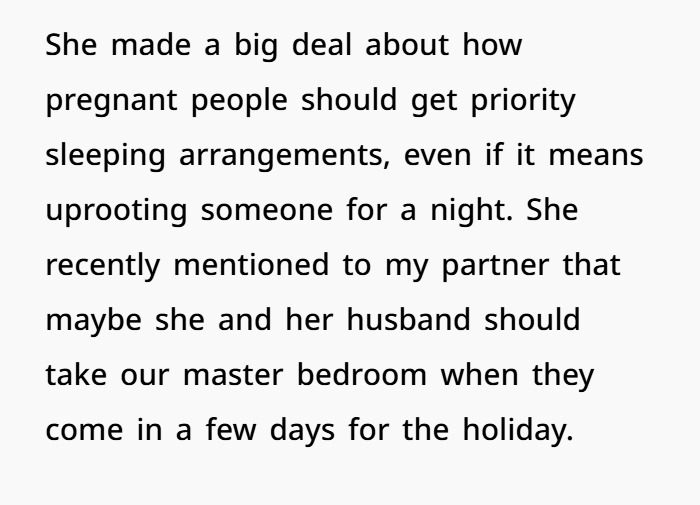 Thanksgiving should be about turkey, togetherness, and peace—not figuring out who gets what bed. But for this couple, hosting the holiday turned into an awkward family power struggle. Their pregnant sister-in-law not only refused the air mattress—they even suggested taking the couple’s master bedroom for the weekend.
