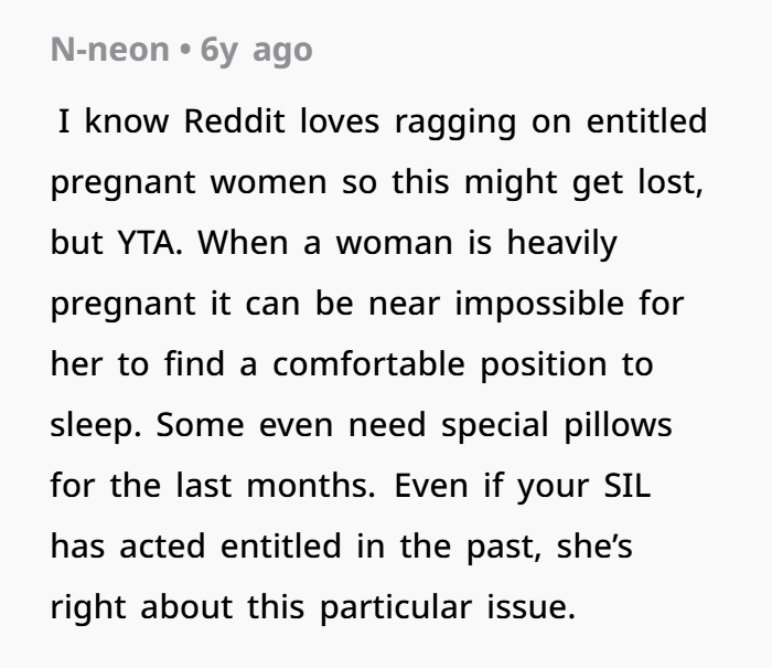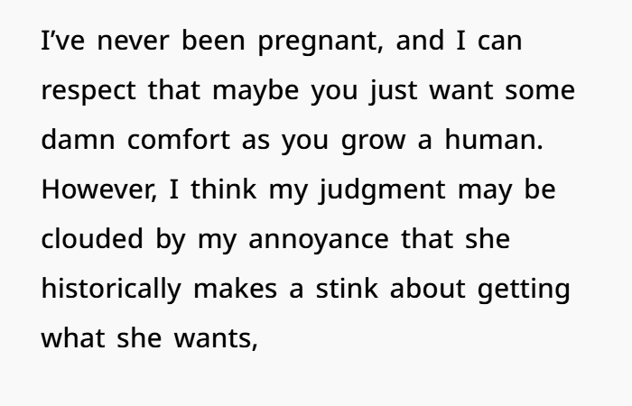 And this isn’t the first time she’s brought it up either. Based on what you said, it sounds like your SIL has a bit of a pattern—making big demands and trying to guilt people into giving her what she wants, whether she’s pregnant or not. That matters. Because pregnancy doesn’t turn someone into a different person. It just amplifies what’s already there.