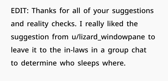 You didn’t ignore her needs. You accommodated them without sacrificing your own peace. That’s a pretty mature move. And as for your parents-in-law? Putting them in the guest room is exactly what most people would do. They’re older, they likely need their own space, and it avoids even more conflict.