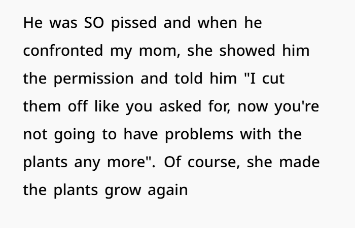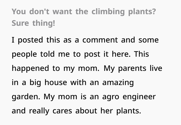 If there’s one thing agro engineers don’t play about, it’s their damn plants. Your mom wasn’t just growing for fun — this was her art, her craft, her living. - Demanded removal instead of compromise