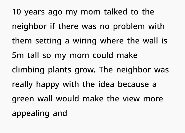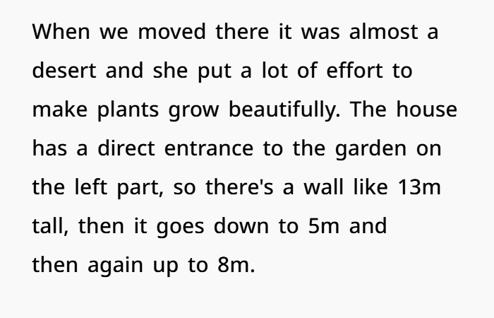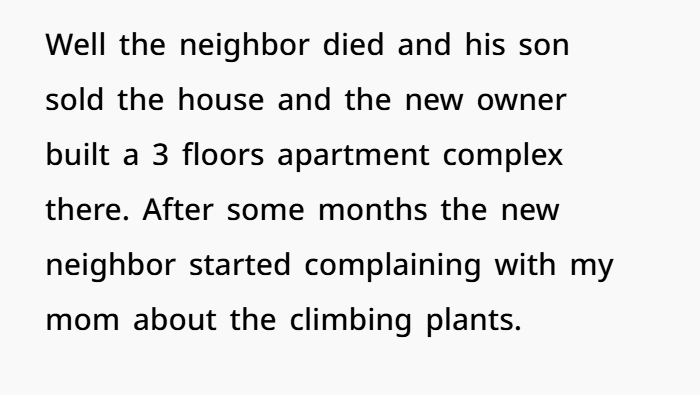 Fast forward: the old neighbor passed, and the house got sold. Suddenly, your mom wasn’t sharing her lovely garden with a neighbor — she was sharing it with a three-story concrete box. The new guy built an apartment complex, towering over her garden.