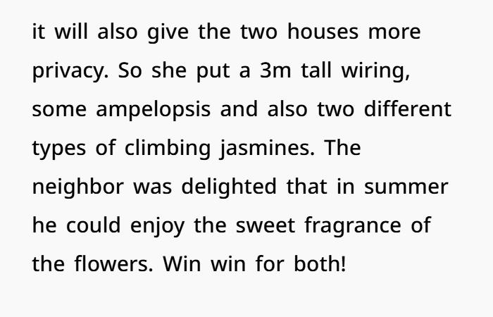 She spent years building that garden. She made it something worth admiring. And part of that vision included creating a lush vertical garden — a green wall on the shared fence. Climbing jasmine, sweet ampelopsis — it smelled amazing, gave natural shade, added privacy, and was basically a living fence.